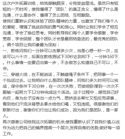 本次活動,同事們在實踐鍛煉中學習,在體驗學習中改變,受益匪淺,有了更多的人生感悟。在體驗著奉獻、協(xié)作、勇敢?guī)淼某晒ο矏偤?,每個人深刻感受到|溝通、責任、協(xié)作、勇敢、自信|的精髓,以及作為團隊中的一員所要承擔的責任,正如美松智能總經(jīng)理黃楊靜先生及同事們所言,利用周日休息天還在撰寫感悟傳遞著: