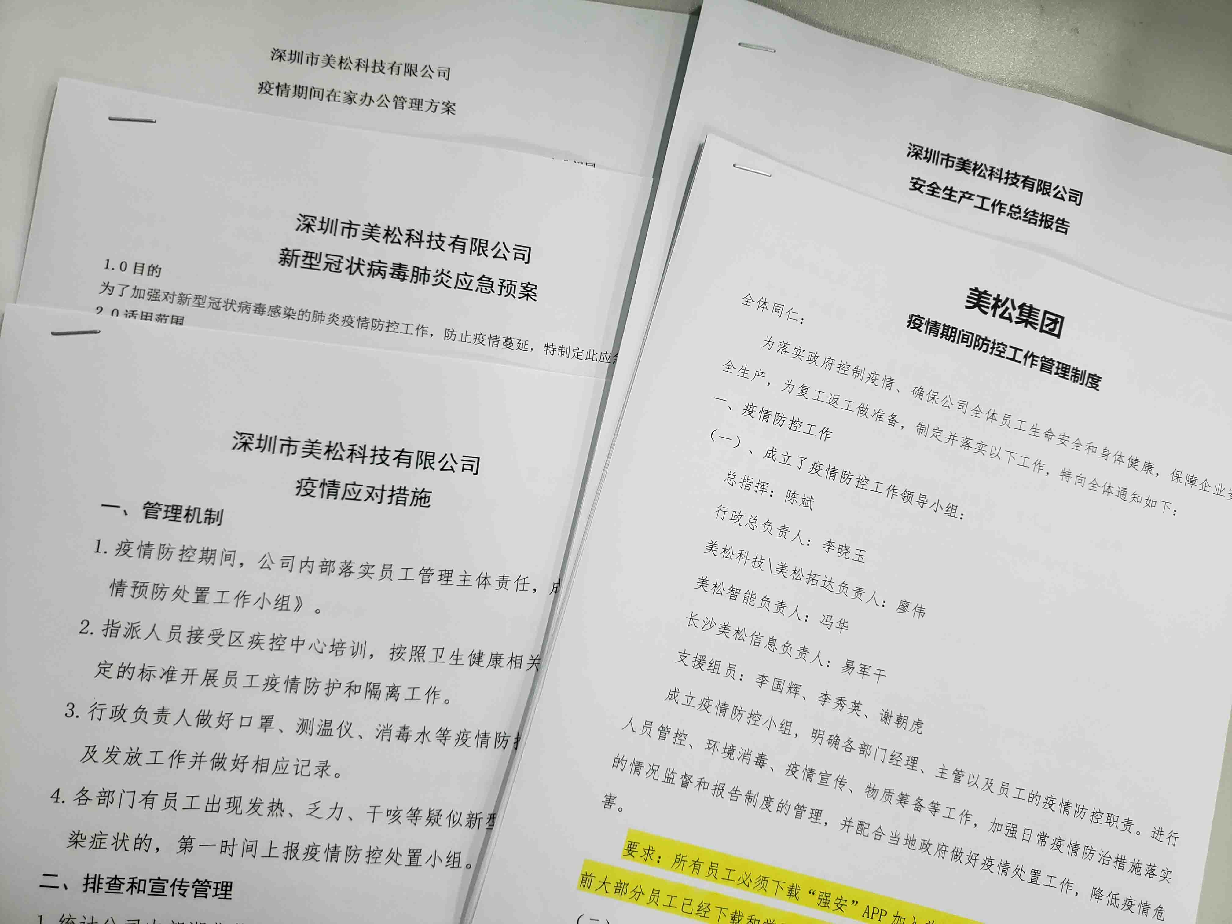 開(kāi)工復(fù)工在即,我們美松集團(tuán)及各下屬子公司也做了充分準(zhǔn)備工作,面對(duì)如此特殊疫情時(shí)期,深圳美松集團(tuán)特制定了《疫情期間防控工作管理制度》、《疫情期間在家辦公管理方案》、《安全生產(chǎn)工作報(bào)告》、《應(yīng)對(duì)疫情應(yīng)對(duì)措施》、《新型冠狀病毒應(yīng)急預(yù)案》,利用網(wǎng)絡(luò)、電話(huà)、現(xiàn)場(chǎng)等多種形式相結(jié)合的方式為客戶(hù)提供服務(wù),保障客戶(hù)需要,通過(guò)差異化的管理,做到疫情防控和經(jīng)營(yíng)服務(wù)“兩不誤”。無(wú)論是在家辦公,還是到崗辦公,全體員工全身心投入到工作當(dāng)中,保持著積極的工作熱情。