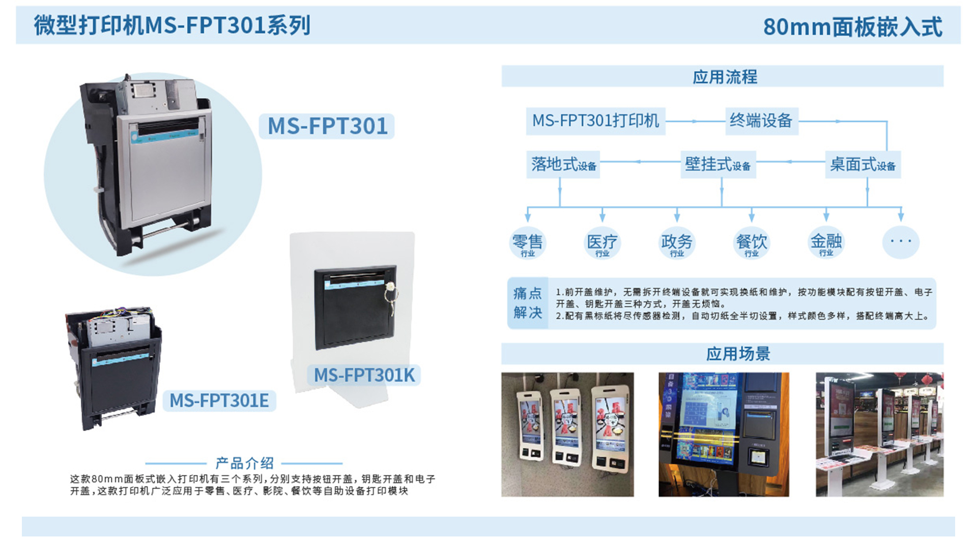 美松MASUNG微型打印機(jī)廣泛應(yīng)用在落地式、壁掛式、桌面式自助終端設(shè)備上,實(shí)現(xiàn)打印票據(jù)功能的模塊。在金融行業(yè),微型打印機(jī)可嵌入ATM機(jī)、自助繳費(fèi)機(jī)、自助存取款機(jī)提供打印需求;在醫(yī)療服務(wù)行業(yè),微型打印機(jī)嵌入自助掛號(hào)繳費(fèi)機(jī)、自助取單查詢(xún)機(jī)提供打印模塊;在消費(fèi)零售行業(yè),微型打印機(jī)為自助售貨機(jī)、自助加油機(jī)、自助點(diǎn)餐機(jī)、自助取票機(jī),新零售自助結(jié)算機(jī)等自助設(shè)備提供排號(hào)打印的功能;在公共服務(wù)行業(yè),微型打印機(jī)適配AFC系統(tǒng),自助圖書(shū)館服務(wù)機(jī)、自助稅務(wù)機(jī)等終端設(shè)備,提供打印模塊。