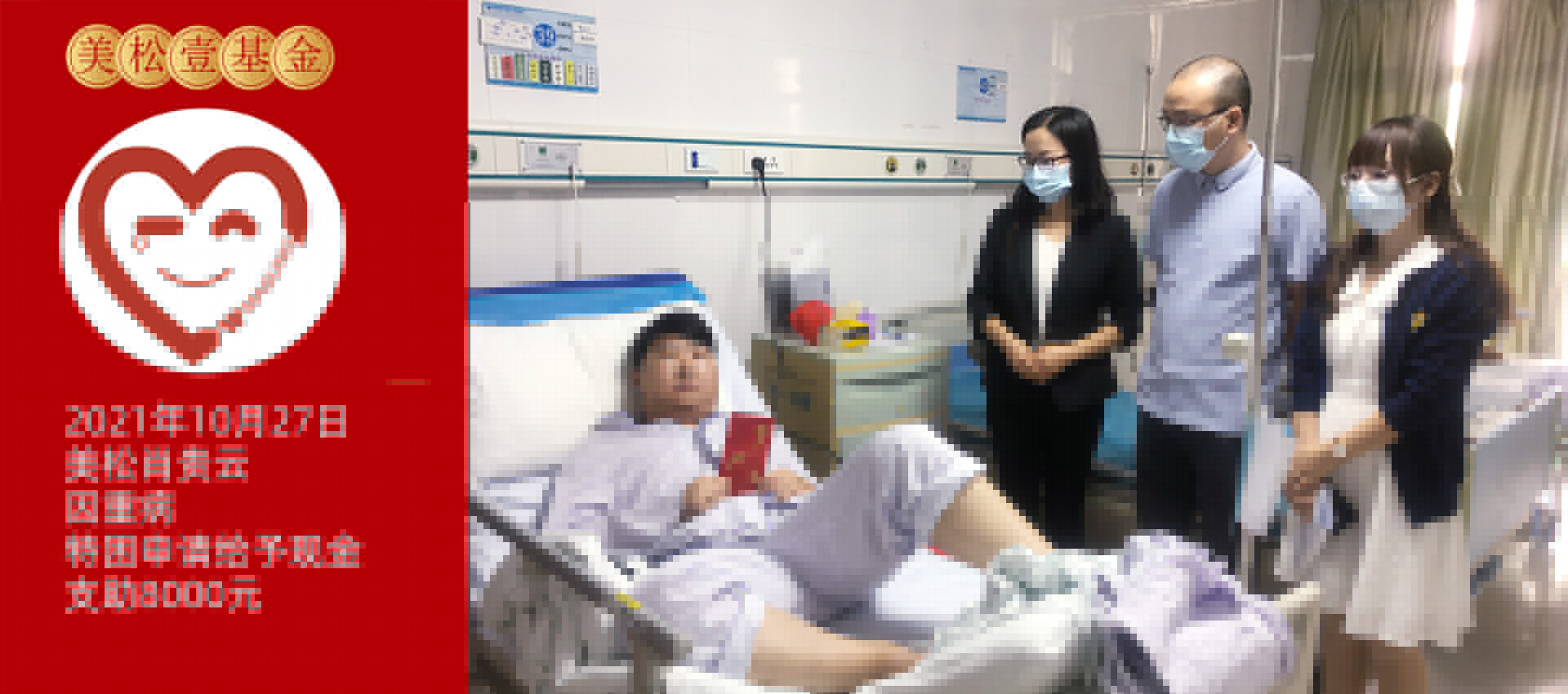 2021年10月27日,美松壹基金委員朱素芳、行政部肖華、廠務(wù)副總戴輝,一同前往光明醫(yī)院慰問生病員工資材部同事肖貴云,為肖貴云及其家人送去8000元愛心款項支助,并表達了親切的問候,在詳細了解了其病情及治療情況后,囑咐他安心休養(yǎng),爭取早日康復(fù)!