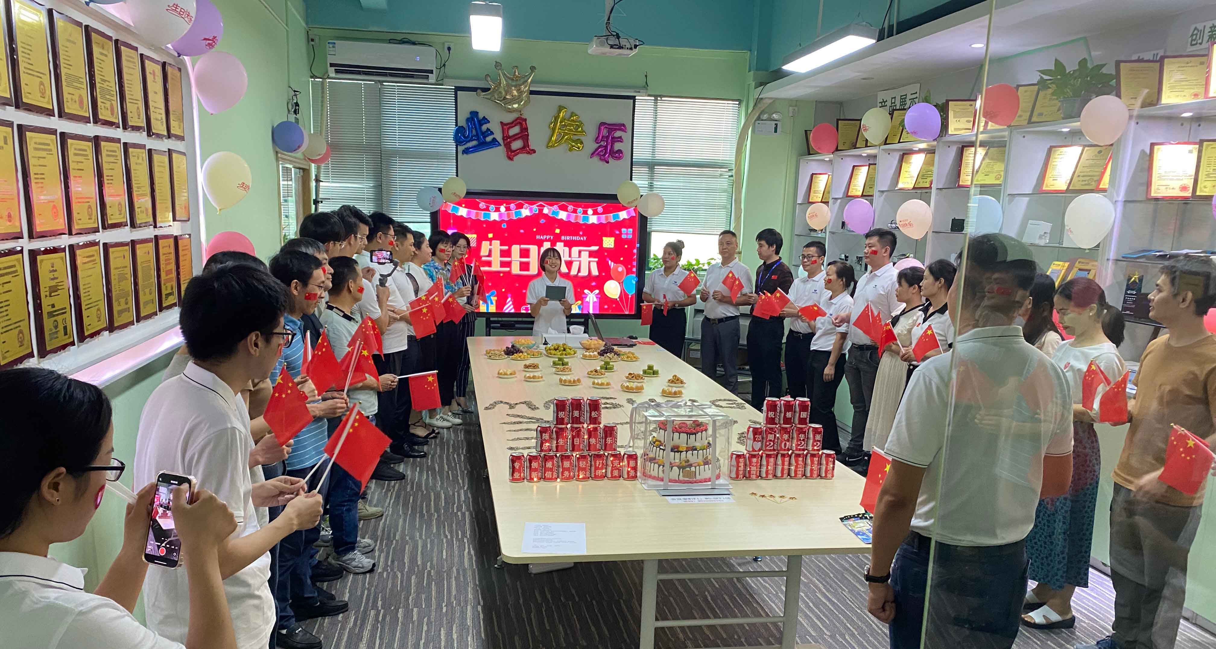 下午3點半,伴隨著現(xiàn)場優(yōu)美歡快的生日歌聲,同事們排起長隊,人手一面紅旗,個個洋溢著歡快的笑容,列隊大步邁向慶祝會場,頓時,辦公室成了紅色的海洋,同時我們的慶祝會正式拉開帷幕。