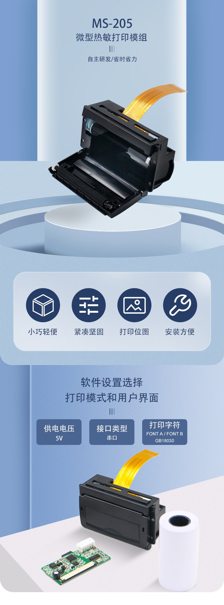 MS-205打印模塊是一種新型行式熱敏打印機模組,它具有打印速度快、噪聲低、可靠性強、打印質量高、安裝方便、結構小巧等特點,免除日常維護的煩惱。