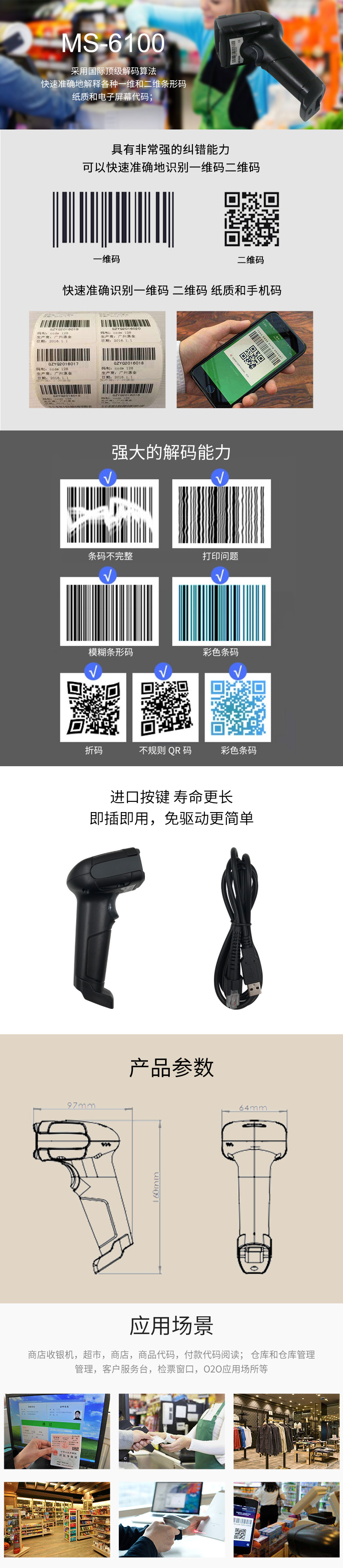 美松一二維碼影像式掃描槍MS-6100掃描采用國際解碼算法,即插即用,免驅動更簡單,對各種一維,二維條碼,紙質和電子屏碼均以快速精準解讀;尤其對殘缺碼,污損碼和變形碼有非常強的糾錯能力,兼容WINDOWS ,Linux,安卓等主流操作系統(tǒng),廣泛用于零售餐飲倉庫快遞行業(yè),手機屏幕收銀行業(yè).