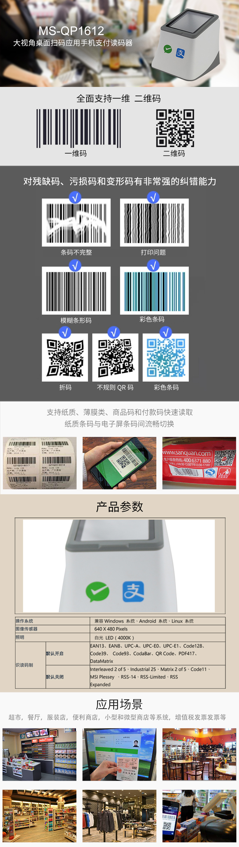 1.大窗口,經(jīng)典外觀,支持貼屏掃碼 2.支持微信、支付寶、美團(tuán)等掃碼支付 3.掃碼成功語音播報 ,解放收銀員,避免漏單 4.接口豐富,內(nèi)置RS232 和USB接口