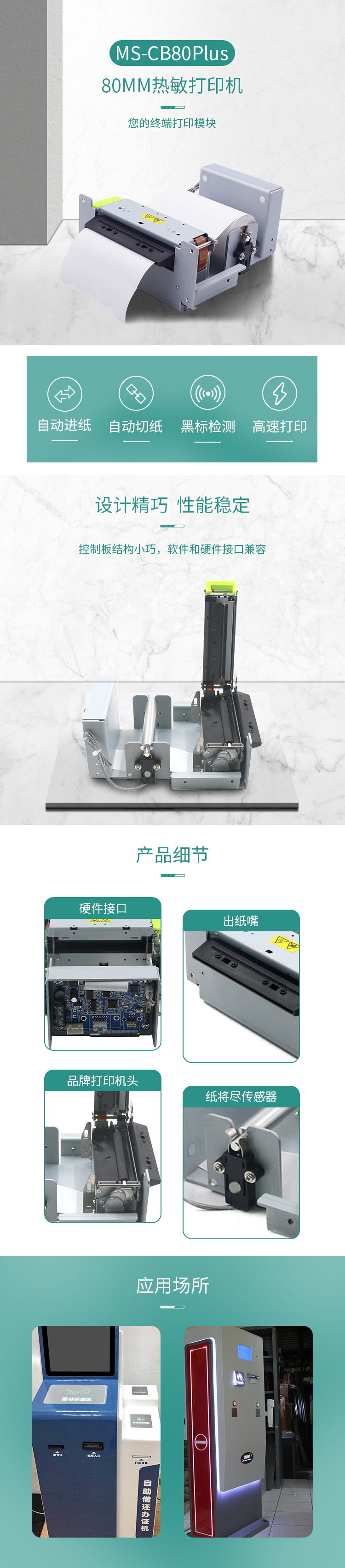 美松(MASUNG)80mm嵌入式熱敏打印機MS-CB80Plus 1.配置超低出紙口 2.側(cè)翻蓋維護 3.適用于矮小空間嵌入的打印機 4.擁有自動切紙、紙將盡、黑標檢測等功能,軟件和硬件接口兼容