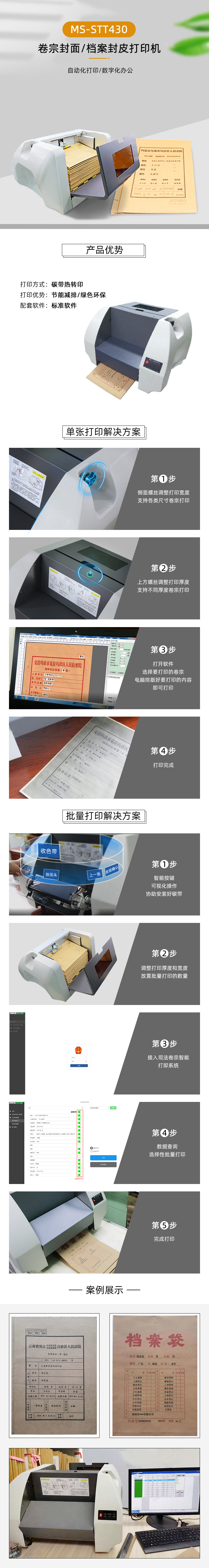 美松MS-STT430是一款批量打印或者單個打印的檔案袋、卷皮封面的打印機,采用碳帶熱轉印方式打印,文字清晰耐刮永不褪色.電腦排版完即可通過USB打印無需制版,方便快捷成本低廉.具有可調(diào)節(jié)紙倉式,批量多本裝入打印方式;機構可靠性高,操作,維護簡單.