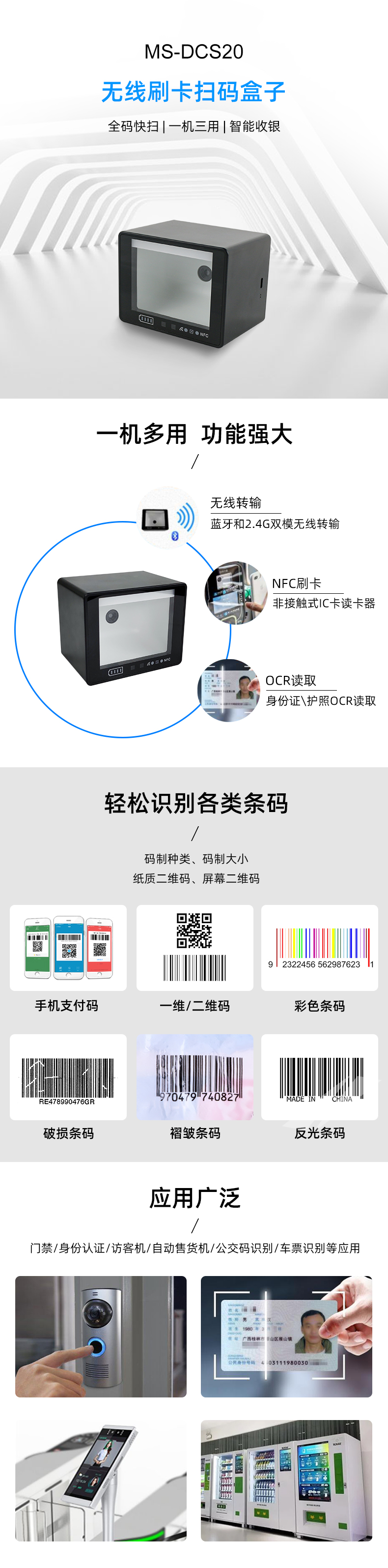 二維碼掃描器行業(yè)應(yīng)用:二維碼掃描器MS-DCS20可桌面亦可嵌入、會議簽到、訪客機、門禁、身份認證、身份證護照OCR讀取,支付、醫(yī)療自助、排隊機等,尤其適用于高密紙質(zhì)、手機碼、要求貼近掃描、需要讀身份證OCR、刷IC卡、無線傳輸應(yīng)用的場景。二維碼掃描器MS-DCS20實現(xiàn)藍牙和2.4G雙模傳輸;選配刷卡模塊可支持13.56Mhz 非接觸式 IC 卡讀卡器,支持 Type A/B 卡識讀;OCR讀取可讀取OCR-A/B數(shù)字,領(lǐng)先的解碼技術(shù),采用自主研發(fā)的核心技術(shù),極速響應(yīng),支持快速開發(fā)和定制需求。