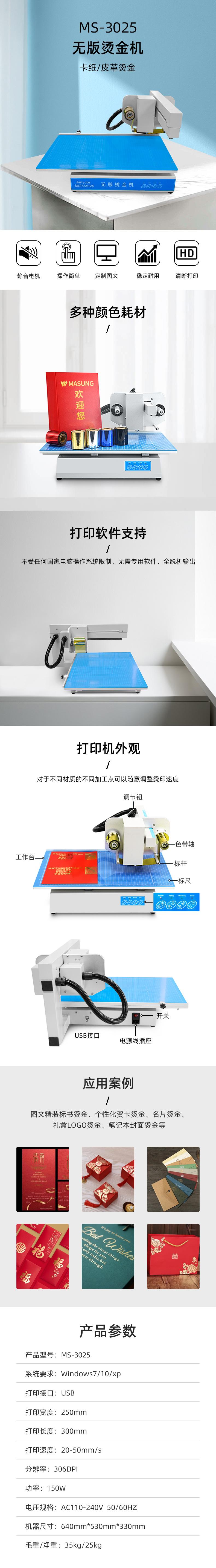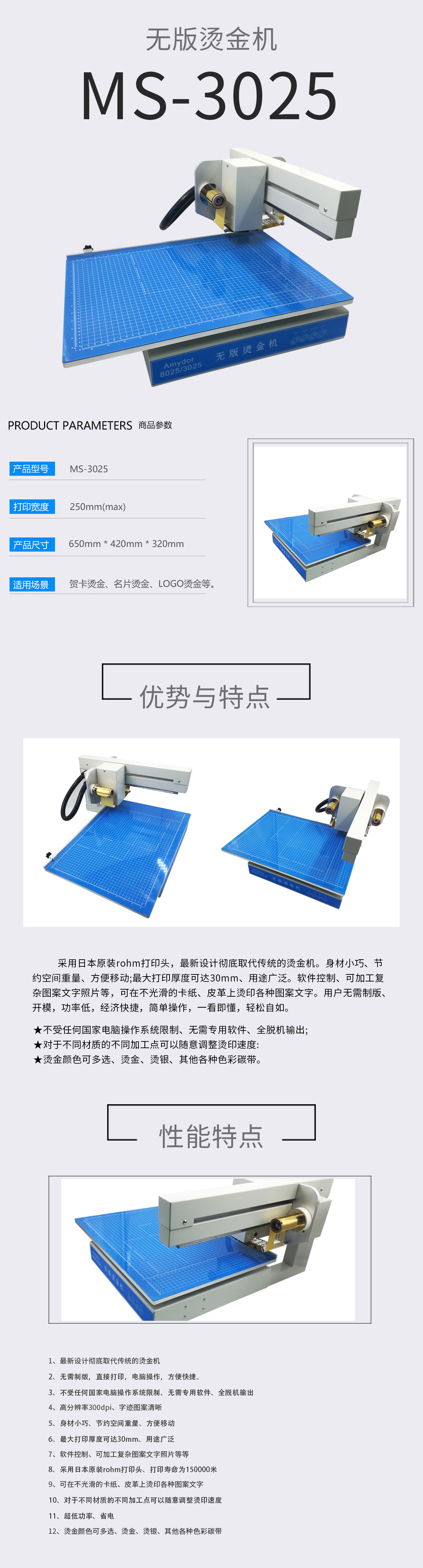 美松無版數(shù)碼燙金機MS-8025,MS-3025采用日本原裝rohm打印頭,最新設計徹底取代傳統(tǒng)的燙金機。身材小巧、節(jié)約空間重量、方便移動;最大打印厚度可達30mm、用途廣泛。軟件控制、可加工復雜圖案文字照片等,可在不光滑的卡紙、皮革上燙印各種圖案文字。用戶無需制版、開模,功率低,經(jīng)濟快捷,簡單操作,一看即懂,輕松自如。