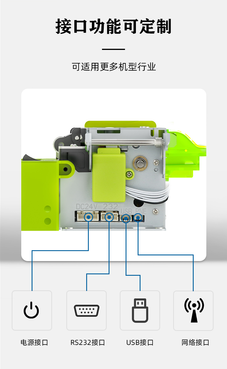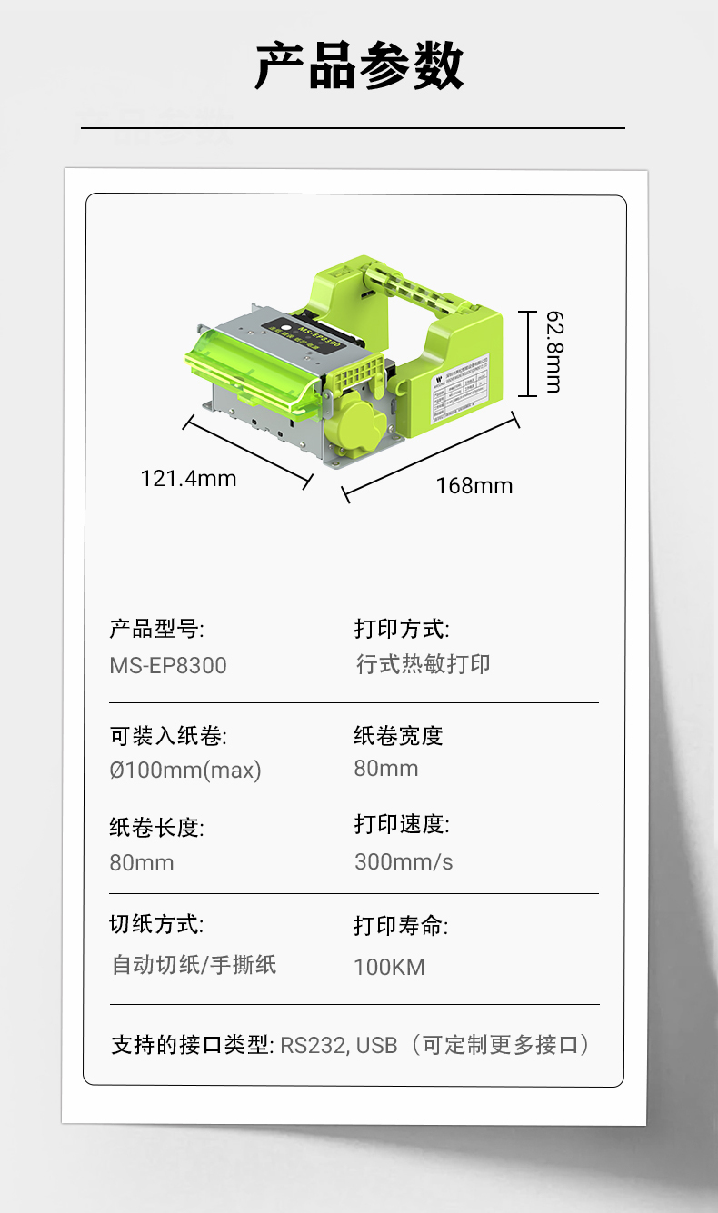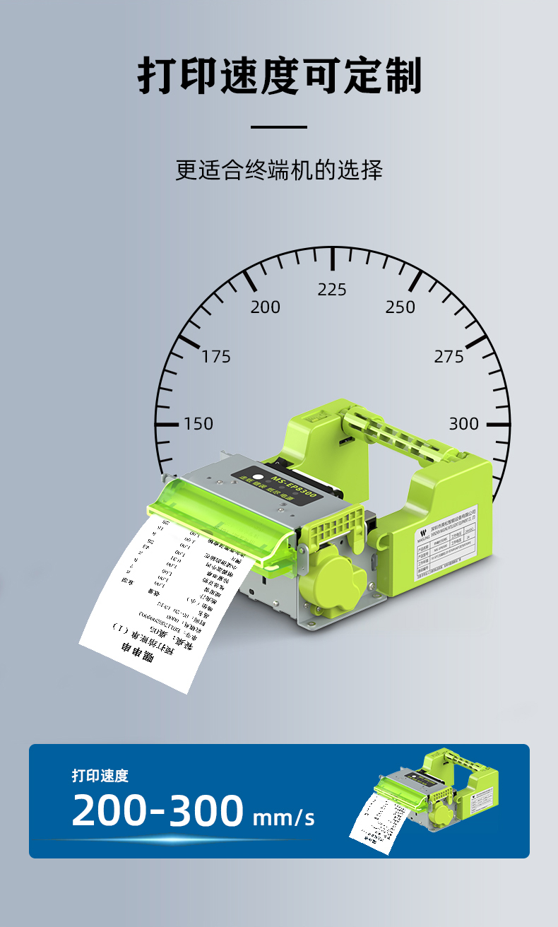 MS-EP8300作為由美松最新自主研發(fā)的高速熱敏票據(jù)自助打印機,采用了最新的“清新綠”配色,在外觀上具有獨特的配色美感,,打印速度最高可達到300mm/s,是一款超高速的打印機,具有多種接口類型可供選擇,RS232接口和USB接口,在操作上還具有多個提示燈和發(fā)光出紙嘴可選,,