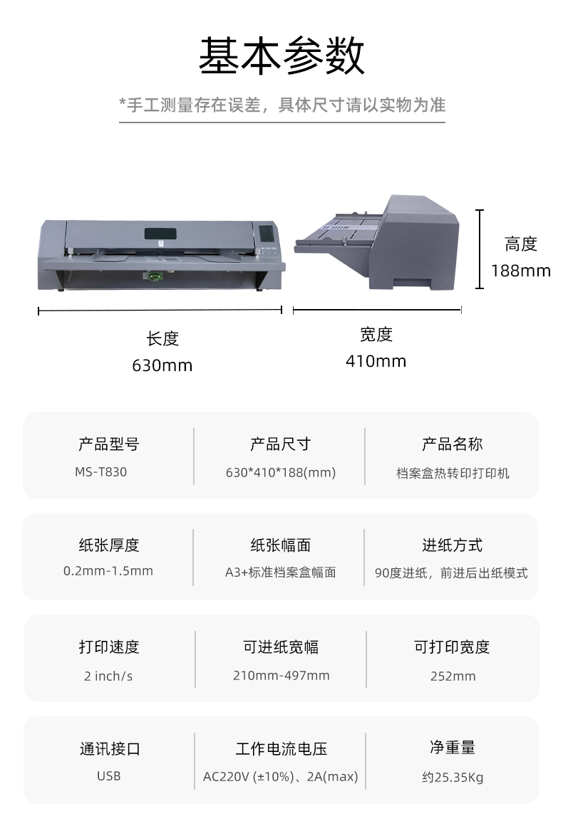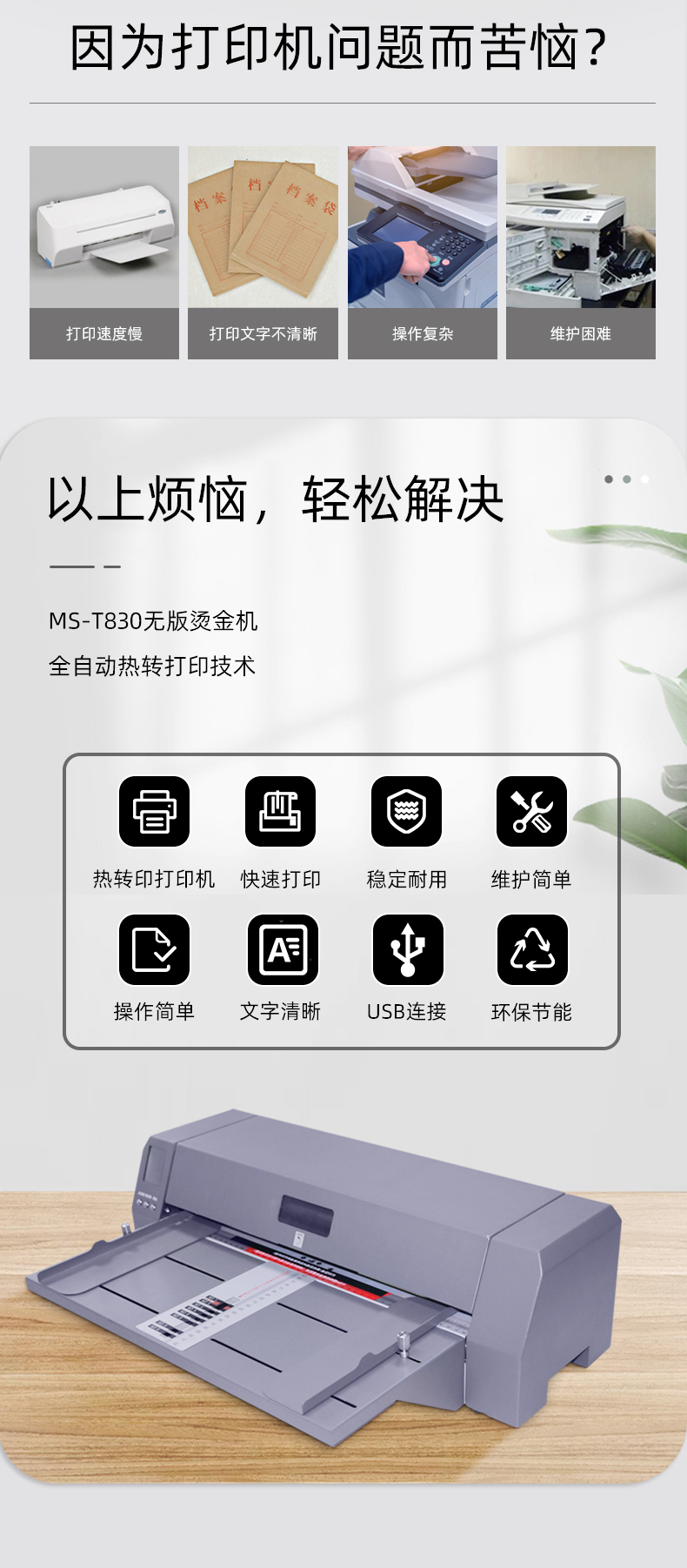 美松MS-T830檔案盒熱轉(zhuǎn)印打印機(jī),熱轉(zhuǎn)印設(shè)備,熱轉(zhuǎn)印機(jī)器針對(duì)已印刷的檔案盒封面進(jìn)行二次加印,或單張空白版面牛皮紙,無(wú)酸紙,證件內(nèi)頁(yè)進(jìn)行打印的設(shè)備.采用碳帶熱轉(zhuǎn)印方式打印,文字清晰耐刮永不褪色.電腦排版完即可通過(guò)USB打印無(wú)需制版,A3+標(biāo)準(zhǔn)檔案盒幅面,方便快捷成本低廉,機(jī)構(gòu)可靠性高,操作,維護(hù)簡(jiǎn)單.適用于公檢法,檔案局,審批局,醫(yī)療診所,教育機(jī)構(gòu),煙草,房產(chǎn)管理,電力,鐵路等行業(yè)。