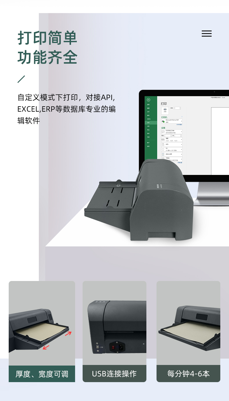 美松MASUNG自主研發(fā)熱轉(zhuǎn)印封面打印機 1.專業(yè)打印牛皮紙,不動產(chǎn)等證件內(nèi)頁,無酸紙檔案盒 2.對接API,EXCEL,ERP等數(shù)據(jù)庫專業(yè)的編輯軟件,自定義打印 3.USB連接操作簡單,耗材成本低,長久保存 4.快速打印,每分鐘4-6本,整齊規(guī)范化 5.進紙厚度可調(diào),適合不同封面打印