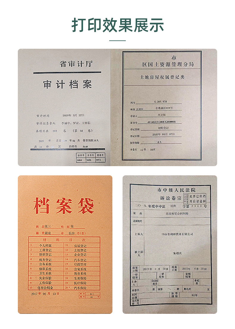 熱轉(zhuǎn)印打印機原理:熱轉(zhuǎn)印技術(shù)利用碳帶介質(zhì)通過熱敏片遇熱和壓力轉(zhuǎn)印到紙或薄膜的過程,當(dāng)卷宗卷皮的單張空白版面牛皮紙,無酸紙,證件內(nèi)頁紙通過打印機的打印頭和壓軸時,將碳帶上的碳粉轉(zhuǎn)印到標(biāo)簽上, 最終形成文字或圖案。