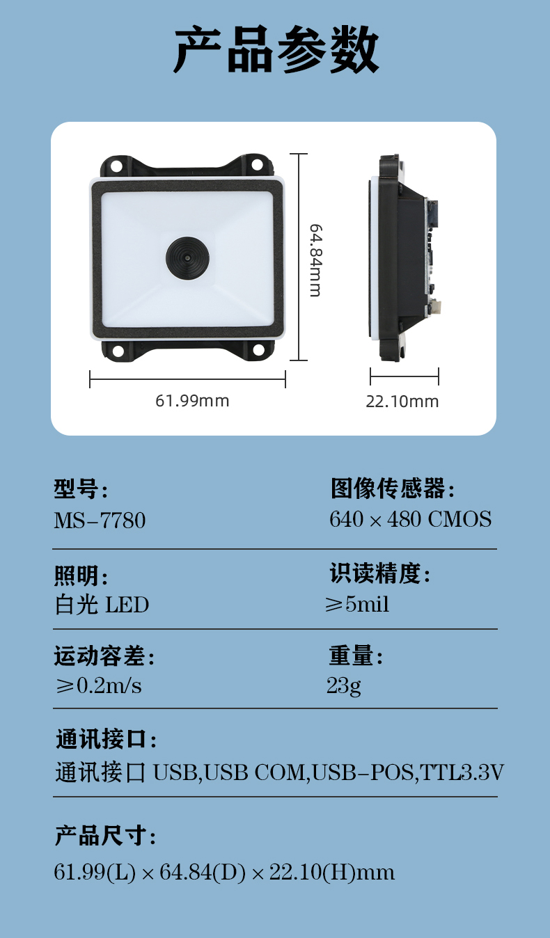 采用自主研發(fā)的核心技術(shù),極速響應(yīng),支持快速開(kāi)發(fā)和定制需求手機(jī)可以貼的更近整機(jī)厚度僅 21MM,更方便集成超強(qiáng)電子屏碼解析對(duì)高密,低對(duì)比度,色彩條碼有較強(qiáng)的解析能力多種接口協(xié)議:USB、USB COM、TTL3.3V、等接口;物理接口形態(tài)有 12PIN 0.5mmFPC(選配)和6PIN MX1.25 間距端子座 集成蜂鳴器、補(bǔ)光燈、端子于一塊核心板 應(yīng)用場(chǎng)景: 車(chē)載 POS、閘機(jī)、門(mén)禁、電商自提柜、藥品售賣(mài)柜、自助查詢(xún)、排隊(duì)叫號(hào)、金融、醫(yī)療、快遞、收銀等自助設(shè)備等,對(duì)電子屏碼應(yīng)用場(chǎng)景尤為適合。