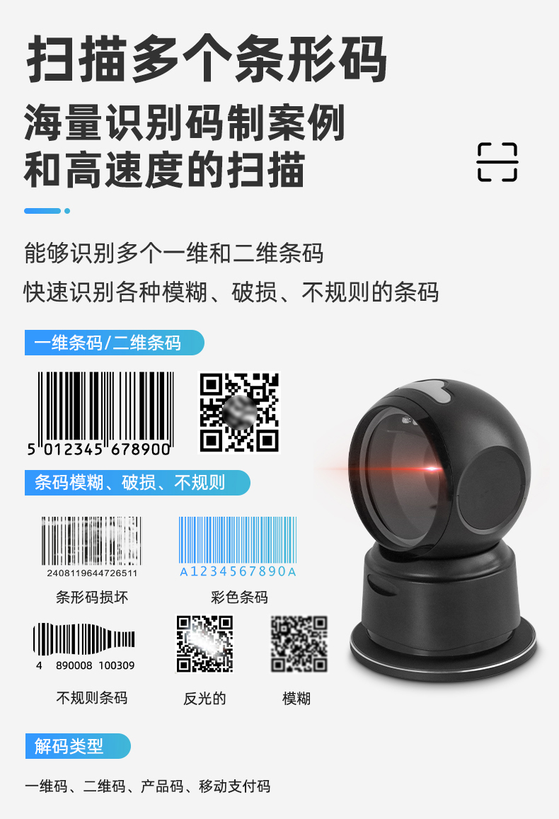產(chǎn)品特點(diǎn): 全局高速解碼技術(shù) 采用自主研發(fā)的核心技術(shù),極速響應(yīng), 支持快速開發(fā)和定制需求 采用二維掃描技術(shù) 兼容一維碼和二維碼的讀取 手機(jī)和紙質(zhì)條碼讀取 采用高速曝光算法,兼容手機(jī)碼和紙質(zhì)碼的 快速讀取 支持多國鍵盤 對不同國家場景可配置對應(yīng)輸出鍵盤 褶皺殘缺碼優(yōu)化 對褶皺和殘缺條碼進(jìn)行算法優(yōu)化,條碼可識讀率更高 應(yīng)用場景: 商超、餐飲、收銀等場景。