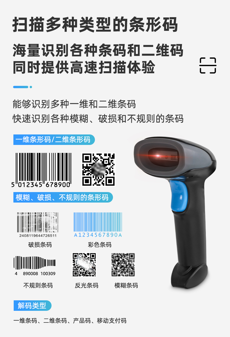 產(chǎn)品特點: 高速解碼技術(shù):采用自主研發(fā)的核心技術(shù),極速響應(yīng),支持快速開發(fā)和定制需求 采用二維掃描技術(shù):兼容一維碼和二維碼的讀取 支持多國鍵盤:對不同國家場景可配置對應(yīng)輸出鍵盤 人體工學(xué)設(shè)計:采用經(jīng)典的人體工學(xué)設(shè)計,符合用戶使用習(xí)慣 手機和紙質(zhì)條碼讀?。翰捎酶咚倨毓馑惴?,兼容手機碼和紙質(zhì)碼的快速讀取 應(yīng)用場景: 商超、餐飲、倉儲、追溯、工業(yè)制造、快遞、收銀等場景。