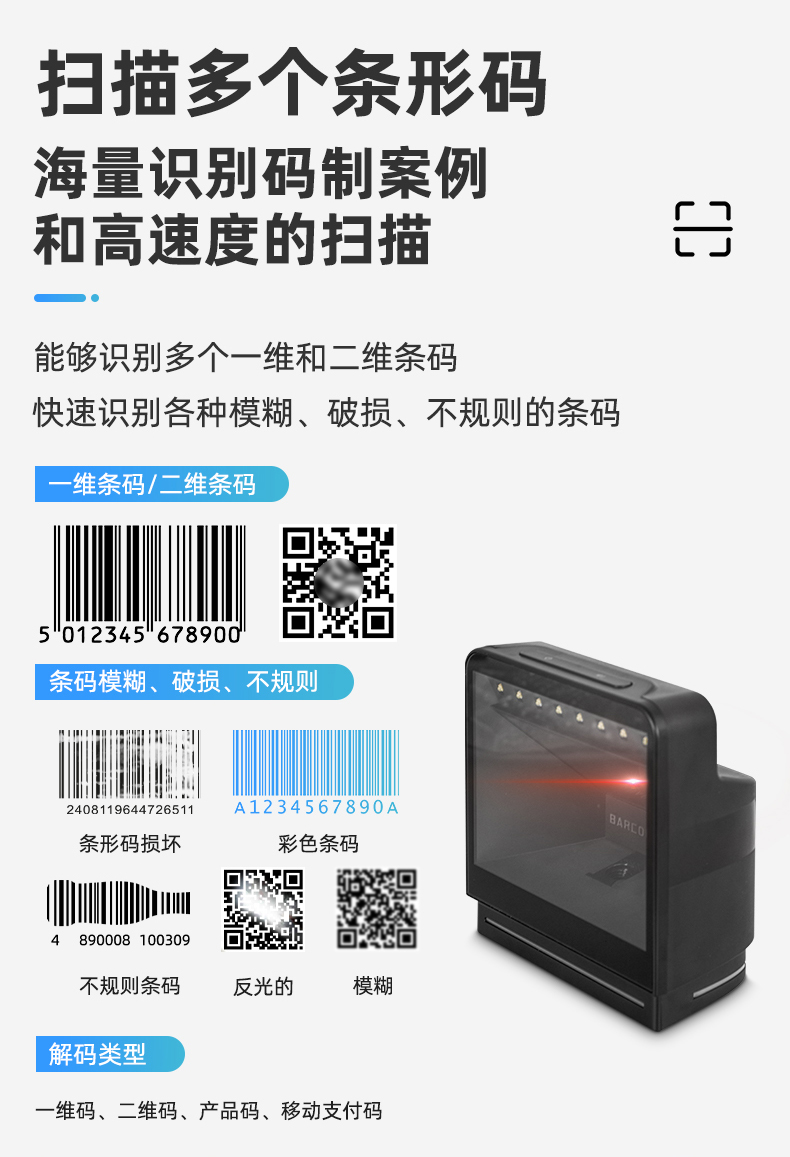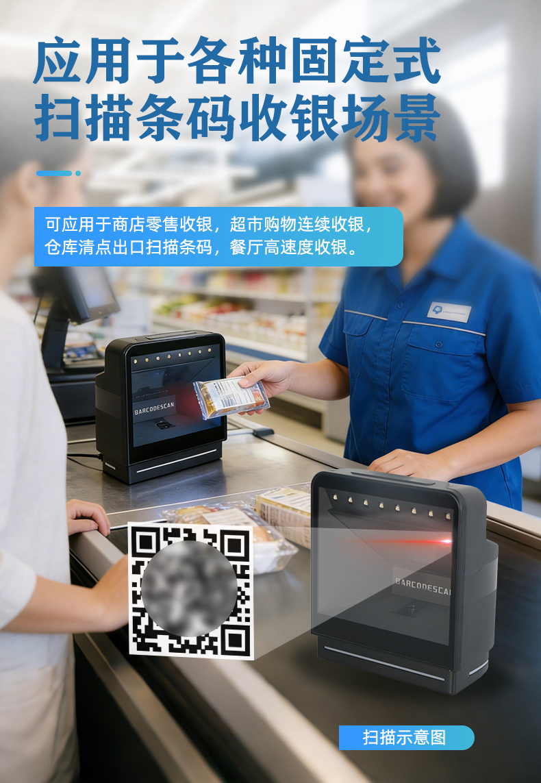 MS-3190_桌面式條碼二維碼掃描平臺是由美松集團(tuán)研發(fā)的一款放置在桌面的收銀掃碼平臺,可同時自動進(jìn)行商品條碼和手機(jī)支付碼的掃描切換,掃描商品條碼后,可立即掃描手機(jī)支付碼進(jìn)行收銀無需手動切換,同時大窗口掃描設(shè)計使MS-3190掃描平臺的識別范圍更廣泛,更快速的識別條碼二維碼,MS-3190還優(yōu)化了識別算法對褶皺條碼、模糊條碼、反光條碼都具有識別能力